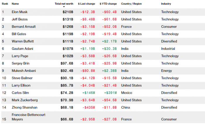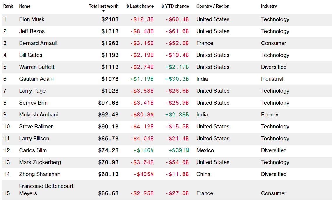 根据彭博亿万富翁指数,现年50岁的马斯克仍然是世界上最富有的人,拥有2099亿美元的财富。今年目前为止,他的财富已累计损失604亿美元(约合4000亿元),仅次于币安CEO赵长鹏(810亿美元)和杰夫·贝佐斯(620亿美元)的财富蒸发量。