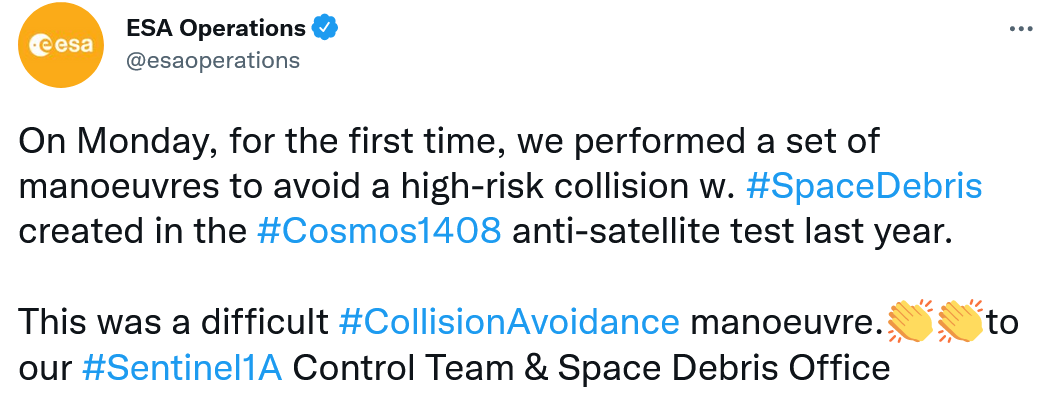 ESA Operations在一条推文中指出:“遗憾的是,避免碰撞监测是任务控制中心的常规工作,我们的团队在应对高风险事件方面有着很好的经验。然而,这次近乎正面的碰撞是独特的;情况发展迅速,难以避免,而且我们只有不到24小时的时间警告。”