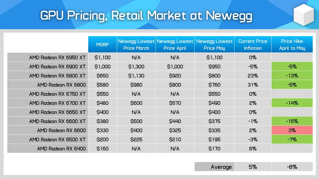 AMD Radeon RX 6000 系列显卡的价格比 MSRP 高出 5%,而新的 RX 6500XT、6600XT 和 6900XT 显卡则低于建议零售价。其他显卡,如 RX 6800 系列,销售价格比建议水平高出 31% 左右。