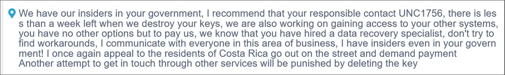 日前,哥斯达黎加宣布向 Conti “开战”,但是目前相关的活动并未完全展开,因此现在关闭显得有点奇怪。Boguslavskiy 透露,Conti 本次如此公开的攻击是为了树立旗帜,打响知名度,而 Conti 的成员则逐渐迁移到更小的勒索软件行动中。