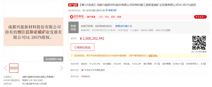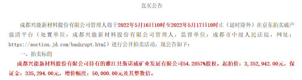 5月16日,在京东破产拍卖平台上,一场特殊的破产清算股权拍卖引起了极高的关注。据了解,此番拍卖的标的为兴能新材料持有的雅江斯诺威矿业54.2857%股权,这背后其实是对于锂矿资源的竞拍(拍卖详情)。
