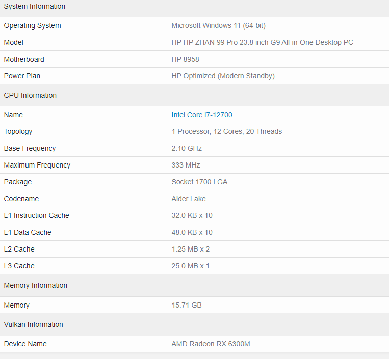 GeekBench 5测试数据里有一台惠普战66 Pro G9一体机,配备了i7-12700处理器、RX 6300M显卡,实测OpenCL跑分为30044、Vulkan跑分为24371。