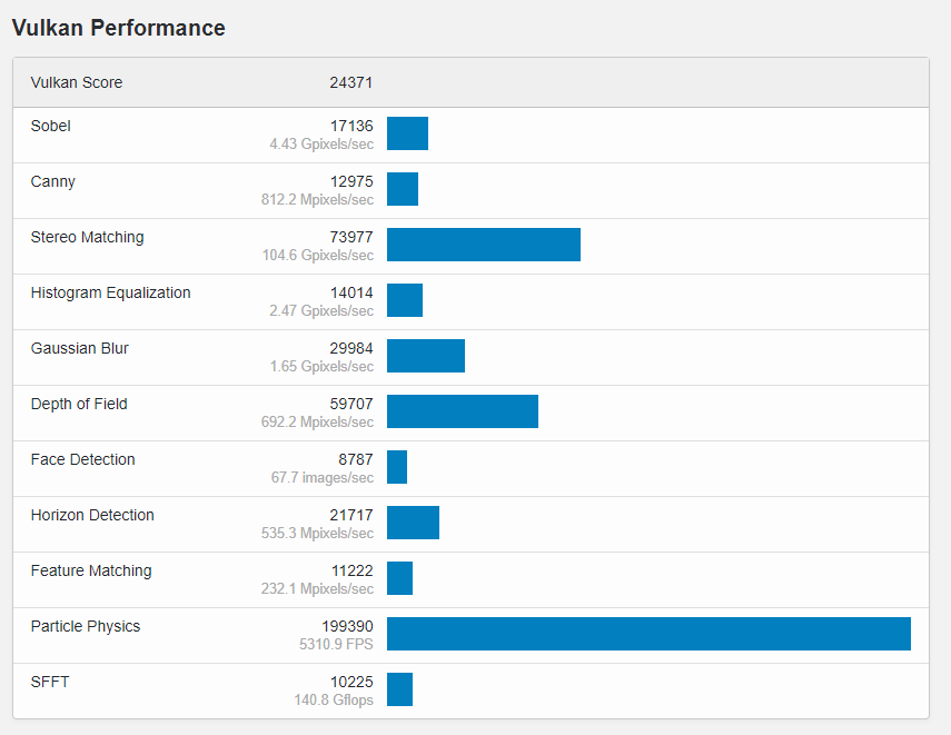 这当然比Intel核显强不少,OpenCL成绩略超MX450 29000分,但是Vulkan成绩又略输MX450 24688分。