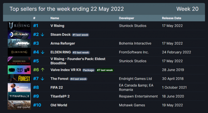 本周第五名是《V Rising》的创始人礼包版本,第六名则是V社的VR套件。