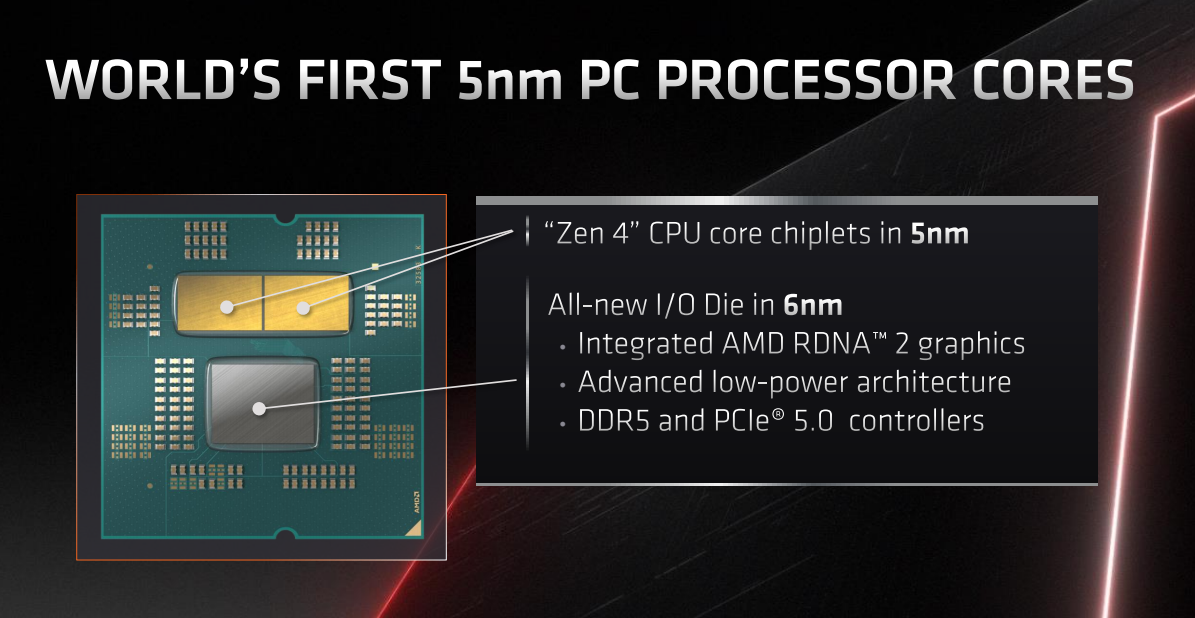 AMD今天下午官宣了锐龙7000处理器,CPU如期升级了5nm Zen4架构,号称单核性能提升15%,频率超过5GHz,演示的加速频率甚至达到了5.5GHz,这方面已经不输友商的处理器了,频率上不会吃亏。锐龙7000还有很多升级值得关注,比如IOD核心,大家都知道AMD在Zen2架构开始就上了小芯片设计,处理器实际上是包括CCD+IOD两部分的,CCD核心集成了CPU单元,其他的IO单元放在了专用的IOD芯片中。