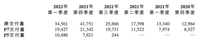 ‧ 于2022年4月,总交付量达9,002辆,按年增长75%。交付中包括3,714辆P7(智能运动 型轿车)、3,564辆P5(智能家庭型轿车)和1,724辆G3及G3(紧凑型智能i SUV)。