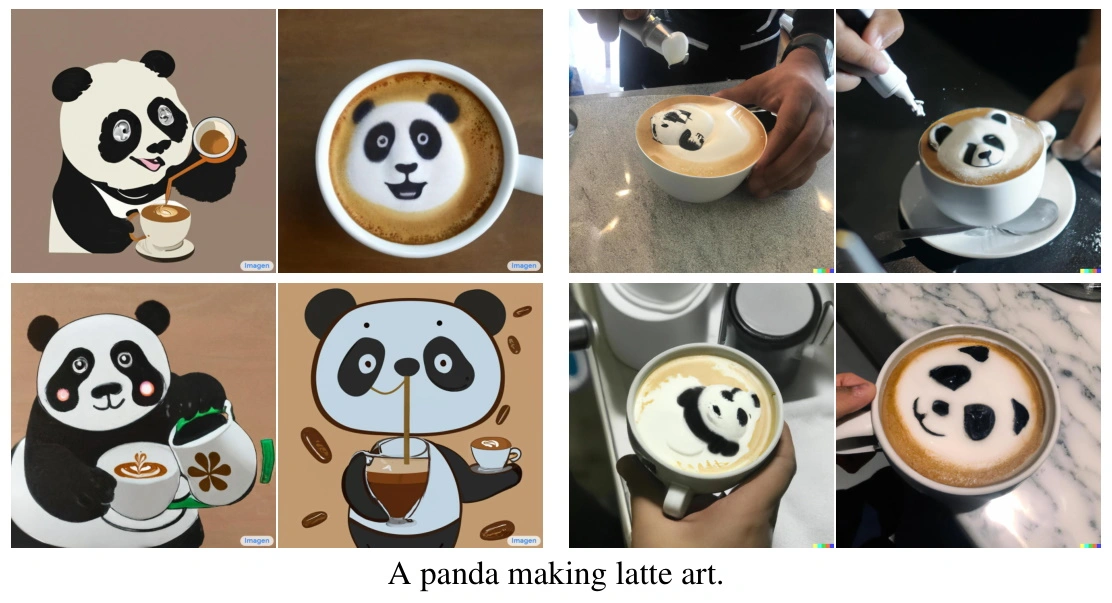 如在描述Imagen的论文中,他们比较了它跟DALL-E 2做“一只熊猫在做拿铁艺术”的结果。在后者的所有图像中,展示的都是熊猫的拿铁艺术;而在Imagen的大部分图像中,都是熊猫在做(拿铁)艺术。