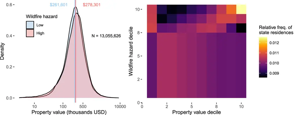 使用精细的空间数据,来自华盛顿特区的独立研究机构 Resources for the Future 的研究团队对美国西部地区住宅以及暴露在山火的相对分享联系上进行了研究。该团队研究了房产的位置、价值、社区特征以及与先前山火的距离。
