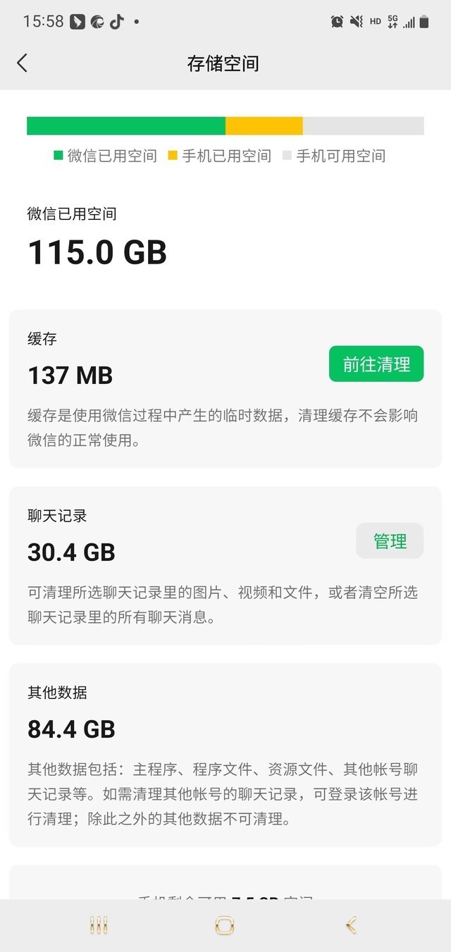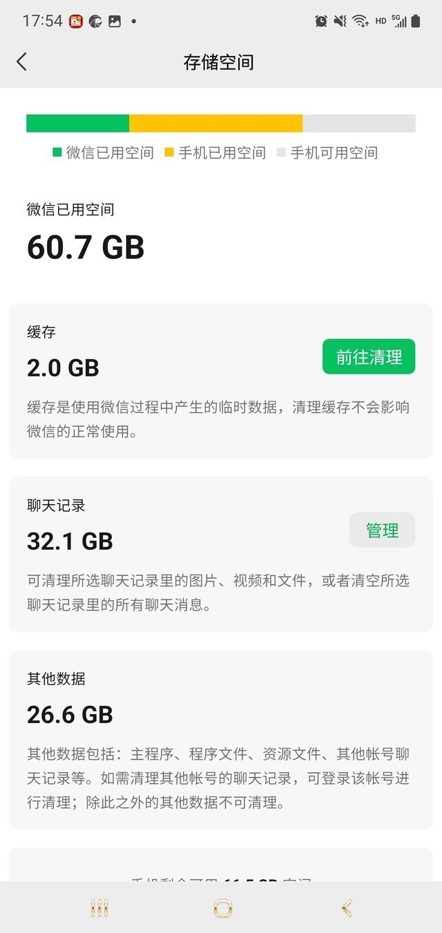 这些数据其实都是死数据。大量缓存的表情、图像缩略、图像、视频缩略、几秒到一两分钟的各种视频文件。它们都在拖累手机速度。我自己的手机剩余可用空间从几百MB,陡然增加到了66.5GB!空间变多并不是直观感受,直观的感受是随着清理的进行,速度会明显的提升。我个人除了关键的工作相关的群,其它群的信息全部清理之后,手机的响应速度变得飞快!