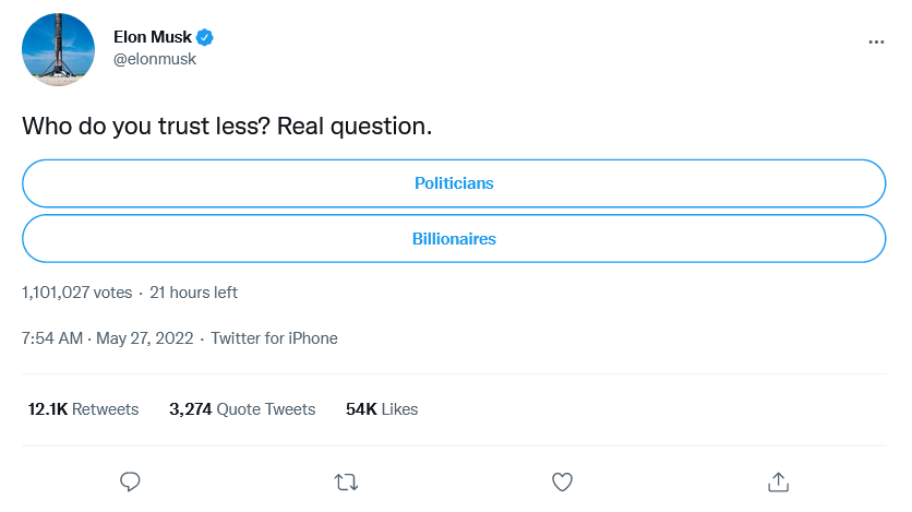 在社交媒体网站推特上的最新民意调查中,埃隆·马斯克询问了他的9500多万粉丝,他们更信任亿万富翁还是政客。到目前为止,他的粉丝大多表示,他们信任富人超过信任政客。