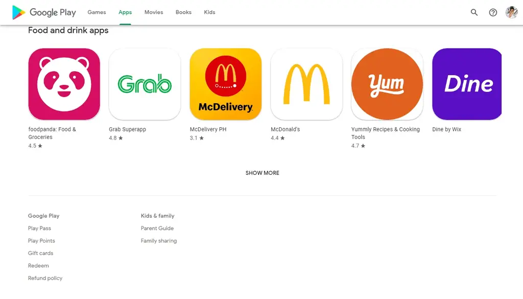 ● 您现在可以访问页面底部的 Play Pass、Play 积分、礼品卡、兑换、退款政策、家长指南和家庭共享链接。