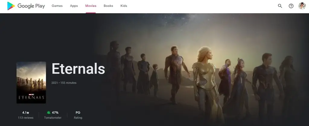 ● 单击“电影”选项卡中的电影也会给你一个很大的部分。但是,不是播放预览视频,而是电影海报占据了很大的区域(尽管有一个视频预览按钮)。在这个视觉部分中还有电影的标题、评论、Tomatometer、评级以及购买或租借电影的按钮。
