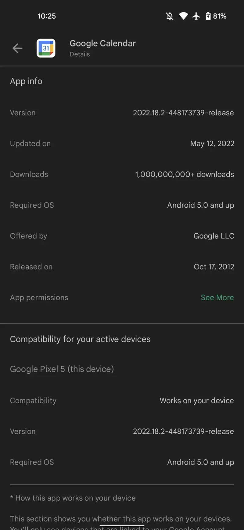 在用户界面进行调整之外,Google Play 在近期的重大调整中还推出了名为“Compatibility for your active devices”(活跃设备兼容性)的新区域,用于表明该应用程序是否与你的设备兼容。