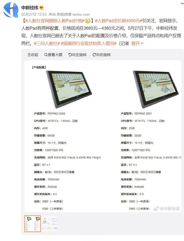 该事件还没有结束,又有网友发现,人民教育出版社官网有一款平板电脑,售价竟高达3680元~4380元。在平板电脑市场,4000元左右的Android平板并不多,这么一款平板电脑立刻引起了网友们的注意,前往查看该平板的配置。