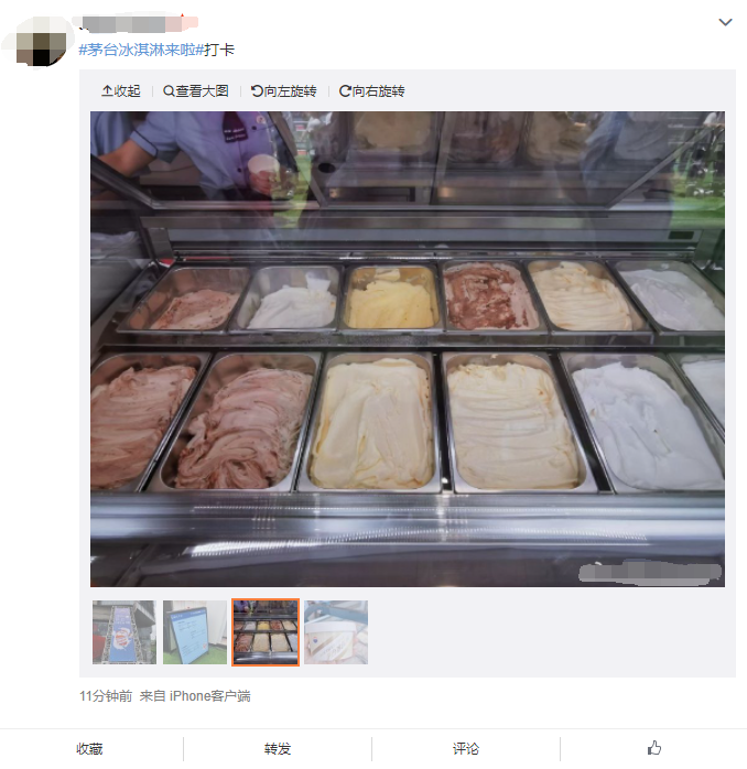 目前已有微博网友在贵阳抢先打卡尝鲜,除茅台冰淇淋外,茅台冰淇淋旗舰店还将提供现制冰淇淋和冰淇淋甜点等多款产品。