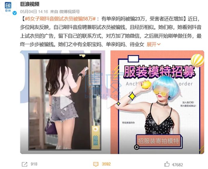 抖音日前发布的《2022年抖音反诈报告》显示,不法分子在平台上发布招聘兼职试衣员或模特的广告,一旦用户与其取得联系,就会被要求下载第三方刷单软件等,再被诱导刷单并缴纳“保证金”,最终上当受骗。