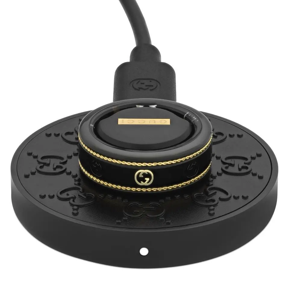 在戒指上也出现了多个 Gucci 的标志性“G”字母,所有都是黑色,但是有个是金色的。这款 Gucci x Oura 戒指还配备了带有互锁 G. Heck 的充电圆盘,甚至 USB-C 连接器上都有符号。