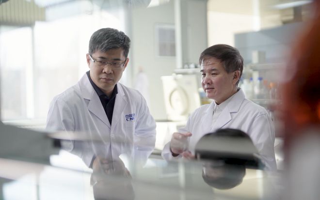 张云涛(右)在实验室与工作人员讨论研发方案。中国生物供图