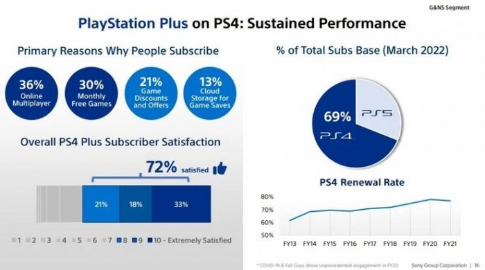 索尼没有透露有多少人接受了调查,但根据数据,36%的用户因为多人在线游戏订阅了该服务,30%的用户因为每月免费游戏,21%的用户因为游戏折扣等,还有13%的用户因为云存档。