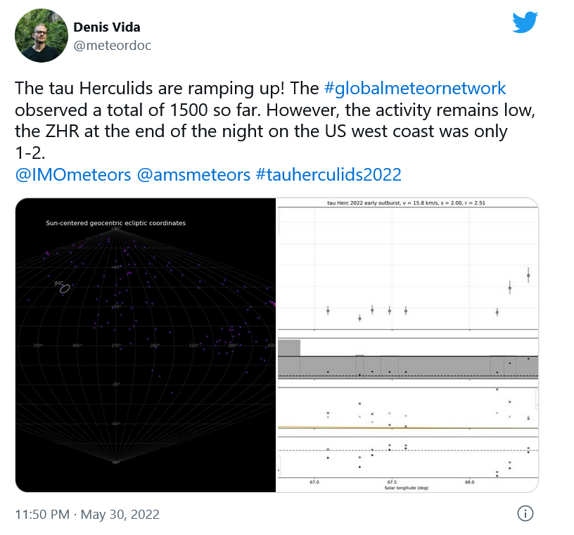 根据美国流星协会的说法,到外面去寻找tau Herculids的理想时间是周一晚上的9:45PT到10:17PT。