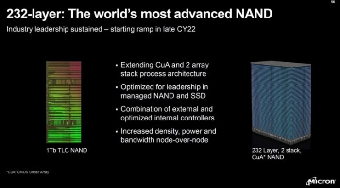 一块SSD硬盘最核心的元件莫过于主控和闪存。日前,在美光的投资者会议上,官方演示232层闪存时提到,SSD未来将使用内部和外部主控,其中内部主控的意思是闪存芯片和主控合二为一。