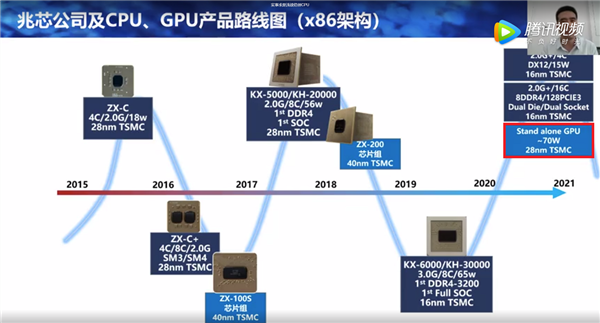 早在2020年7月,兆芯就官方披露了独立显卡路线图,台积电28nm工艺,功耗约70W,当时预计2020年底或2021年推出。