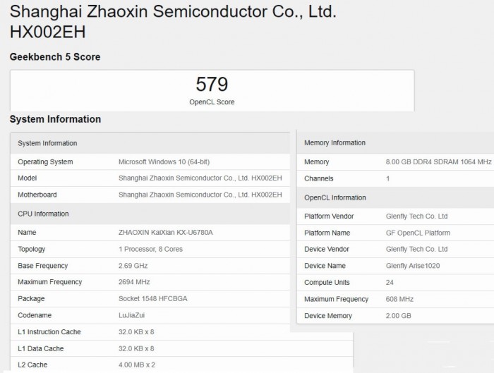 近日,GeekBench跑分数据库里出现了一套兆芯的系统,不但有兆芯处理器(8核心8线程/8MB L3/2.7GHz)、兆芯主板,更有兆芯显卡!