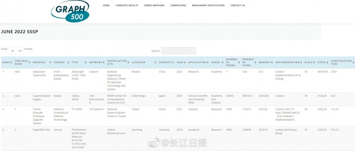 6月2日消息,据@长江日报 报道,在6月1日德国汉堡举办的国际高性能计算大会上,公布了第24届Graph 500排名。据悉,由华中科技大学图计算团队研发的图计算机DepGraph性能打破图计算性能世界纪录,登顶全球最权威图计算榜单,同时,在国际上首次实现单机性能超越超级计算机图计算性能。