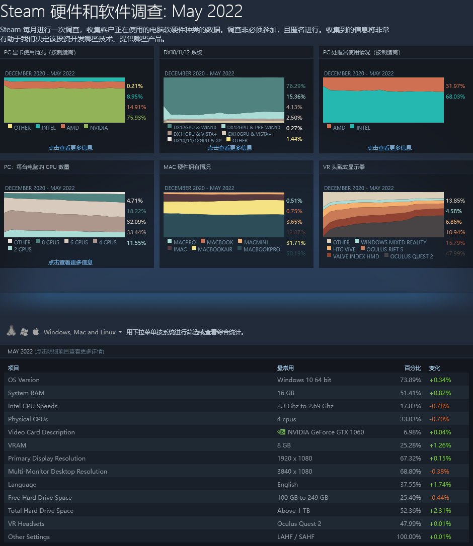 GPU:NVIDIA占75.93%,AMD有8.95%,而英特尔保持8.95%。最受欢迎的显卡是NVIDIA GTX 1060,NVIDIA GTX 1650,以及NVIDIA GTX 1050 Ti。