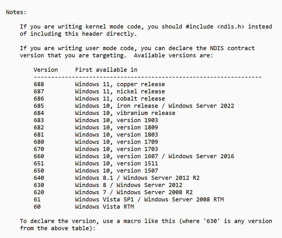 首先,我们似乎可以看到许多有关于网络驱动接口规范(NDIS)的版本,分别用于几个不同的Windows版本,包括即将到来的Windows 11 23H2开发版,微软称其为(Copper release)。