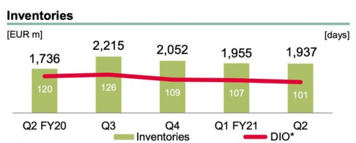 ▲ 2020 年~2021 年一季度英飞凌库存走势(注:2020 财年 Q2 意为 2020 年第一季度)