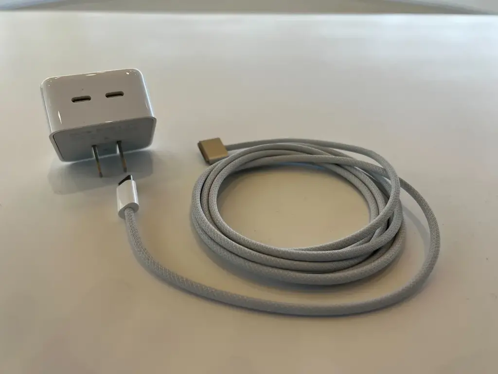除了每台笔记本电脑随附的颜色匹配的 MagSafe 充电线外,您还可以选择最多三个不同的充电器。我们在上面看到了全新的双端口 35W USB-C 充电器,还有一个 67W USB-C 快速充电器,这两者都是基础型号随附的 30W 充电器的加价产品。您可以在购买时额外支付 20 美元获得任一升级充电器,或者您可以免费选择价格更高的 1,499 美元型号的升级充电器。