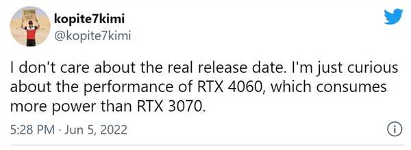 kopite7kimi坦言,他已经不在乎什么时间发布了,只好奇性能如何,比如RTX 4060能不能超过RTX 3070。