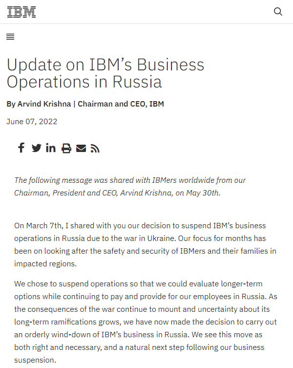 在周二的一份备忘录中,IBM 首席执行官 Arvind Krishna 宣告了将“有序缩减”其在俄罗斯业务的消息。事实上,在俄乌冲突爆发后,IBM 早在今年 3 月就加入了其它西方公司的行列,冻结了在俄罗斯的业务运营,但仍在向当地员工支付工资。