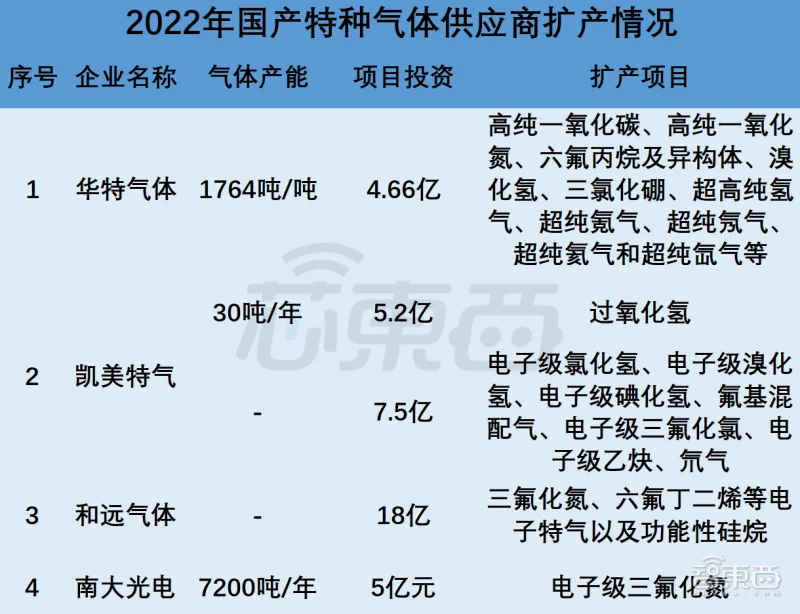 ▲芯东西不完全统计国产特种气体玩家扩产计划(截至2022年6月)