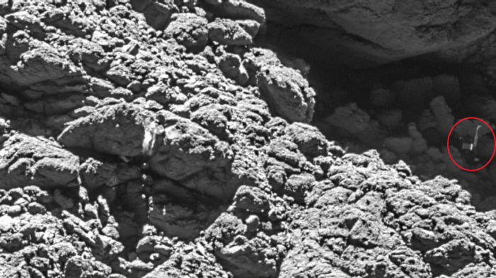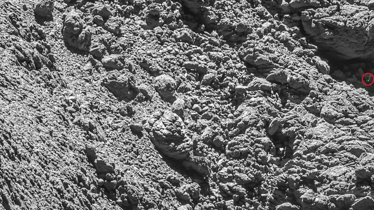 一天终于迎来了好消息,一个目光敏锐的研究人员在图像的角落里发现了一些东西。着陆器本来就是一个很小的斑点,你必须放大才能看到它。而现在“菲莱”就在悬崖下,在一个突出的岩架下侧躺着,并且在阴影中。