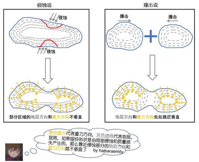 目前主要有两个观点:一是它的中心被侵蚀了,所以它一开始是一个更球形的东西,通过一些未知的过程变成了今天的形状。