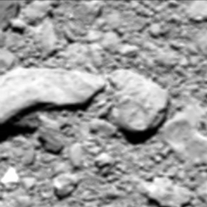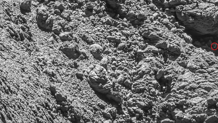 当“罗塞塔”扫描这颗彗星寻找失踪的探测器时,它飞到离彗星表面约3公里的地方,近得足以投下阴影。这个距离足以让“罗塞塔”能够嗅到彗星的表面的气味。