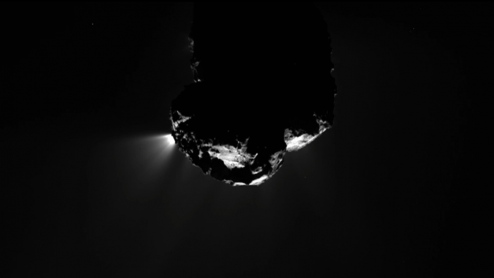 当“罗塞塔”扫描彗星寻找丢失的着陆器时,它面临着一个新问题,当这个脏雪球冲向太阳时来自太阳的辐射会把它加热,所以它开始噼啪作响,变形。这就像一场烟花表演,巨大的气流从地表喷射出物质。