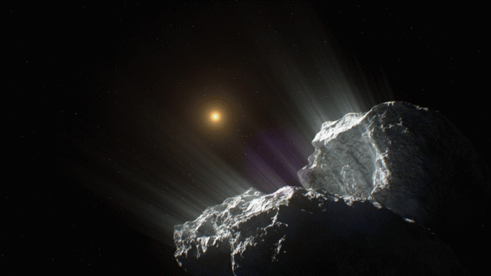 科学家们认为这是一种多米诺骨牌效应,太阳加热了地表深处的一些挥发物,它们升华并变成了气体。然后只要有任何微小的裂缝或缝隙,就会从彗星上发射出去。但这一过程削弱了彗星表面的一部分,这将释放更多的物质。当物质要从里面喷出来时,它将开始迫使气体通过类似喷嘴的功能,就像喷气机一样。