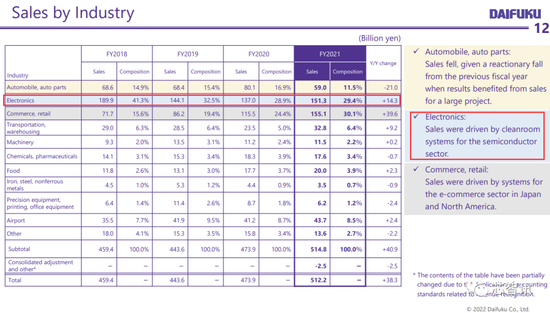 日本半导体设备厂商大福集团(Daifuku)的2021财年(2020年4月-2021年3月)销售收入为5122.68亿日元。查询财报,统计2021年四个自然季度的总销售收入为4965亿日元,约合45.68亿美元。其中来自电子行业(主要为半导体行业的洁净室存储、搬运系统)的收入占比约为29.4%(2021财年),基于此估算,其2021年自然年度收入约13.43亿美元,也有望进入2021年全球前20大半导体厂商排名。