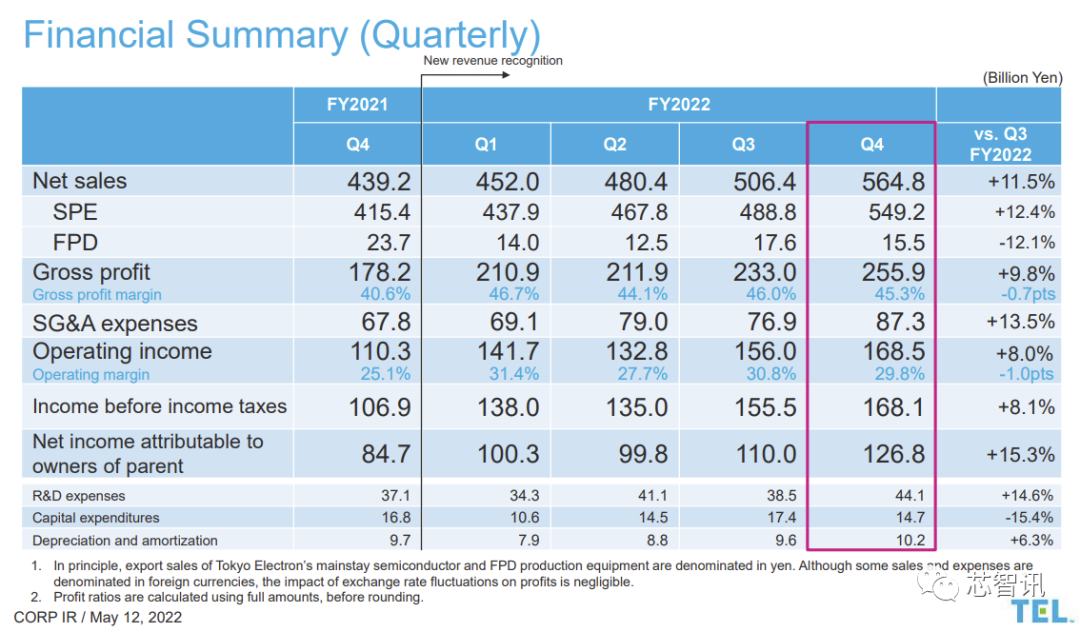 东京电子今年一季度的营收为5648亿日元,同比增长11.5%,毛利为2559亿日元,同比增长9.8%。来自中国大陆的营收占比为22%。