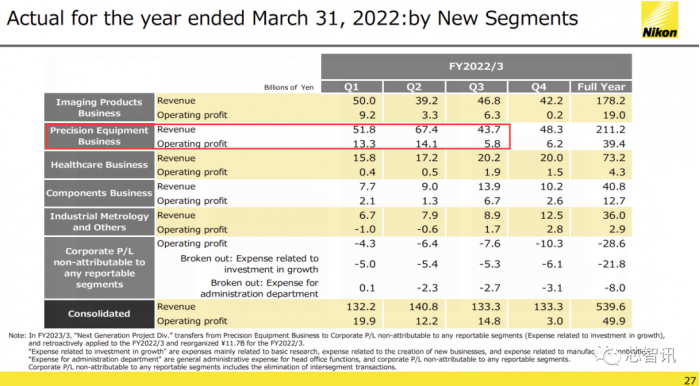 尼康的2022财年是自2021年4月1日-2022年3月31日的12个月,并且其业务范围较广,光刻机仅为其主营业务之一。因此,我们根据财报统计了2021年自然年度其精密设备业务(包括半导体设备和FPD设备)的销售额,总计为2172亿日元,总计约为19.98亿美元。