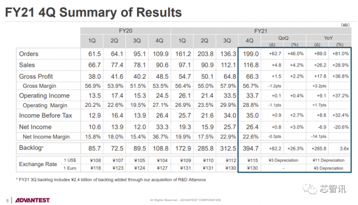 东京电子2021/22财年(2021年4月1日至2022年3月31日)财报显示,该财年营收20,038亿日元,同比增长43.2%。根据其公布的2021自然年度的四个个季度的业绩合计约18780亿日元(包括了FPD生产设备营收678亿日元),按照2021年1日元兑0.0092美元的汇率中间值计算,约合172.78亿美元。