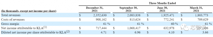 财报显示,应用材料截止2021年10月31日的2021财年营收为230.6亿美元,同比增长34%。为了尽量靠近2021年自然年的业绩,我们用其2021财年的营收加上其截止于2022年1月30日2022财年第一财季的营收(62.7亿美元),再减去其截止2021年1月30日的2021财年第一财季的营收(51.6亿美元),即应用材料在2021年自然年度的营收约为241.7亿美元。
