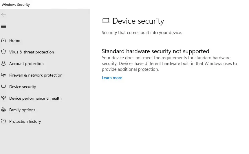 但是,当用户 PC 不满足这些要求中的一项或多项时,将显示标准硬件安全不支持功能。不过在此错误的情况下,即使满足条件,它也会显示不支持。