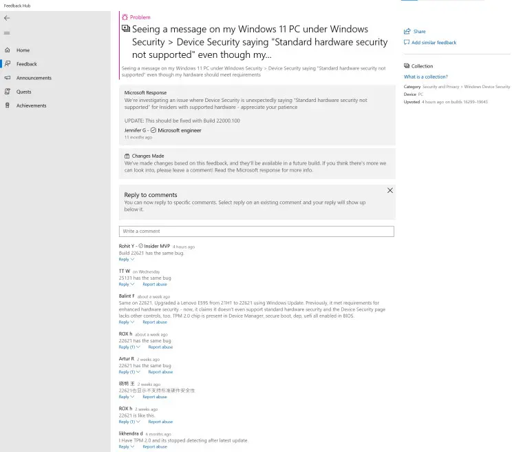 而这并非个例,因为有不少用户也在 Feedback Hub 中抱怨 Build 22621 存在这样的错误。正如上面提到的,这个错误并不是新的,微软早先已经用 build 22000.100 修复了这个问题,就像公司在反馈中心线程中承诺的那样。