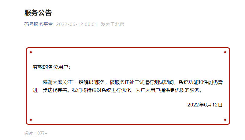 6月12日凌晨,中国信通院旗下“码号服务平台”微信公众号(原“一号通查”)发布“服务公告”,公告表示,感谢大家关注“一键解绑”服务,该服务正处于试运行测试期间,系统功能和性能仍需进一步迭代完善。我们将持续对系统进行优化,为广大用户提供更优质的服务。