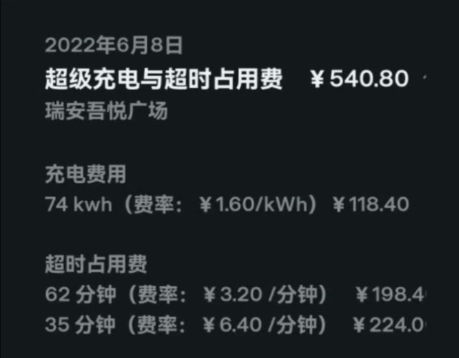 网友公布的充电账单详情显示,充电总费用540.8元,其中,冲了74KWh电,1.6元/kWh,总费用118.4元;而超时占用费共有两档,分别是198.4元和224元。