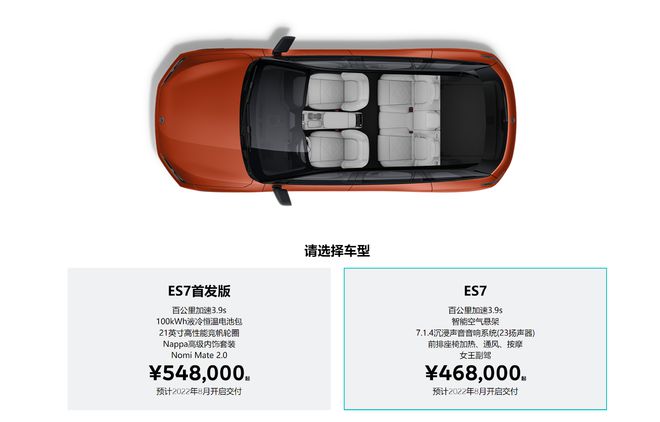 蔚来ES7补贴前标准续航电池包起售价46.8万元;长续航电池包52.6万元起;首发版为54.8万元,BaaS方案补贴前起售价42万元。即日起于蔚来APP开放预订,预计2022年8月28日开启交付。